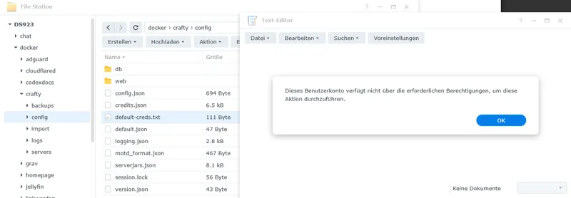 Leider gibt es über die Synology File Station und den Synology Text-Editor mit der default-creds.txt vom Crafty Controller Berechtigungsprobleme.