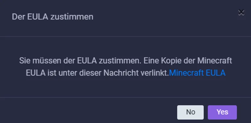 Beim ersten Mal muss die Minecraft EULA mit Yes bestätigt werden.