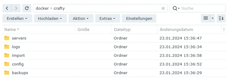 Ich habe hier im docker Ordner einen crafty Ordner angelegt. Dort wiederum Ordner für backups, logs, servers, config und import.
