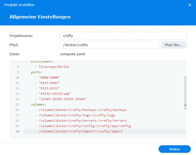 Die Installation via Docker Compose erfolgt im Synology Container Manager unter Projekt.