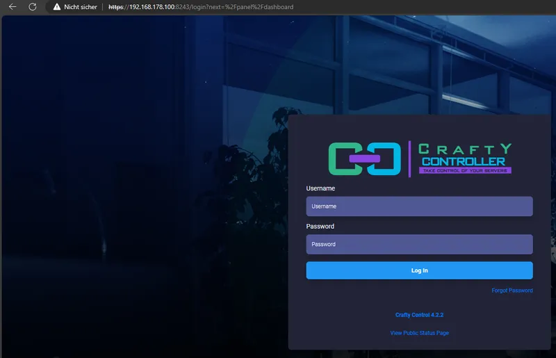 Die Zugangsdaten beim ersten Start des Crafty Controllers befinden sich unter /volume1/docker/crafty/config/default-creds.txt sofern so konfiguriert wie oben erklärt.