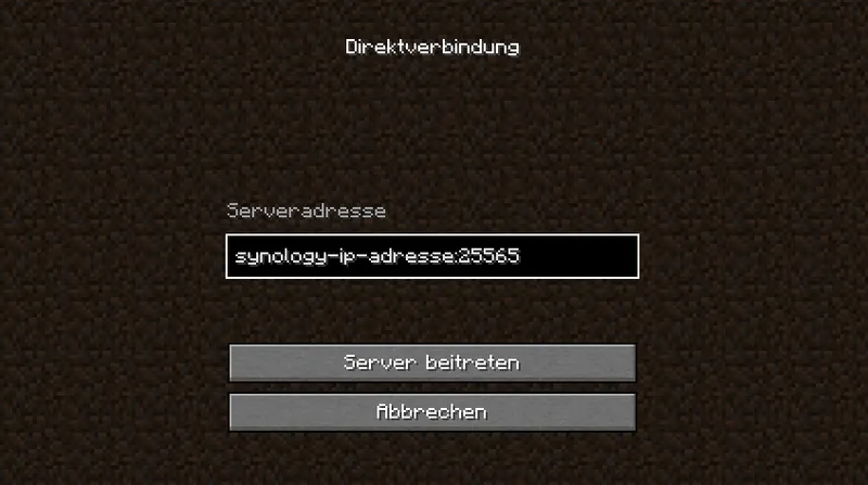Dem Server kann dann über <synology-ip>:<port> beigetreten werden.